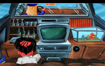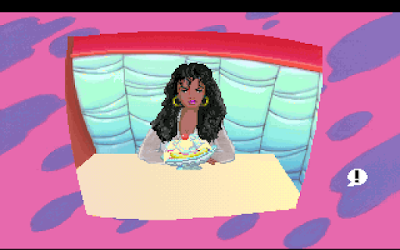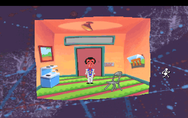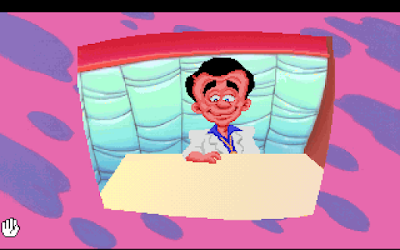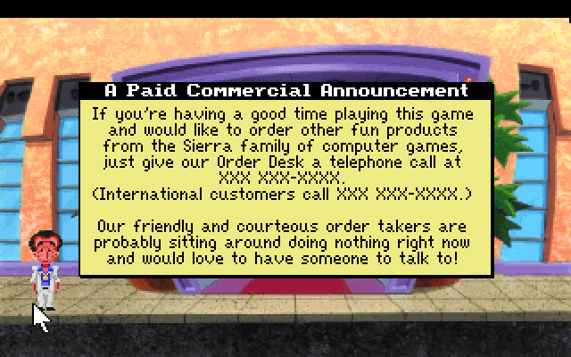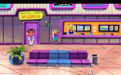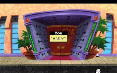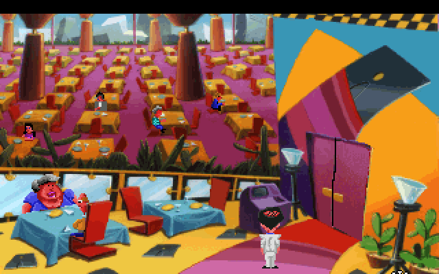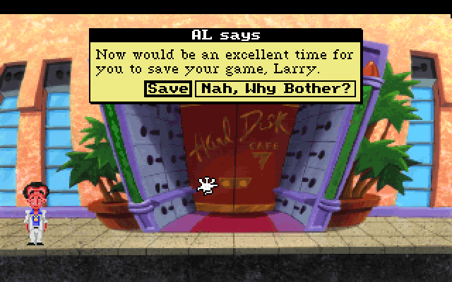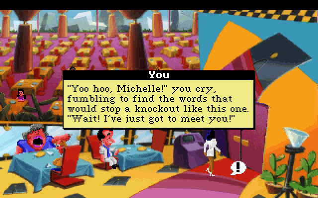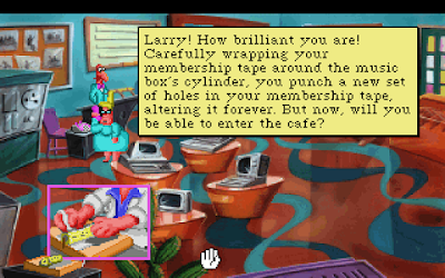 Well, this is lame. The machine there tells Larry that, basically, his membership tape doesn’t have what it takes to get him into the inner sanctum of the Hard Disk Café where, hopefully, he will find Michelle. The maître d’ refuses to upgrade Larry’s tape; not even a bribe will do. Nothing left to do but take a seat and see what happens.