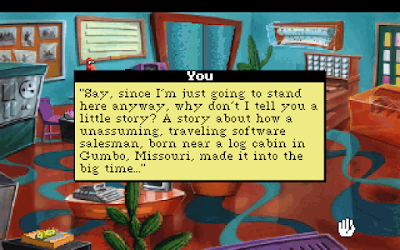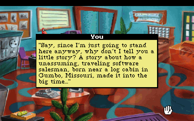 Could that music cylinder in the corner of the lobby be of any use? Say it with me again: This is Larry 5, so of course it does. I click the tape on the cylinder (12 points), making a new set of holes in Larry’s tape, which sounds kind of painful. For some reason, this upgrades Larry to a SuperUser named Gilbert Hyatt, granting him access to the ultra-chic Hermann Hollerith room (12 points). Gotta love adventure game logic!