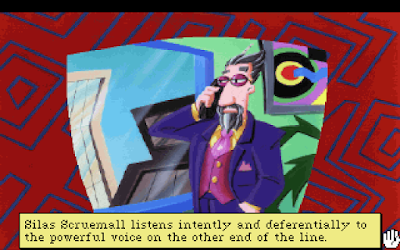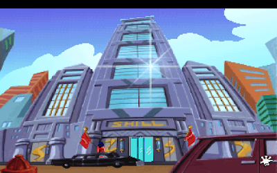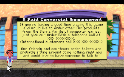 Anyway, Larry staggers back to the lobby (40 points) and outside the Hard Disk Café. No limo. Heading back into the lobby, I see that the woman in the blue dress is off the phone. A quick call to the limo company Larry called from the airport makes a limo instantaneously materialize (2 points), so Larry hops in, shows the driver his AeroDork card, and is on his way back to LaGuardia.