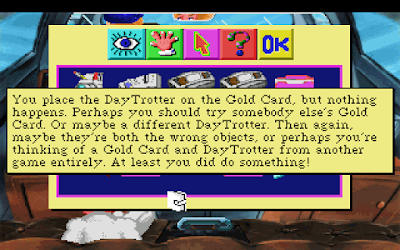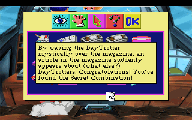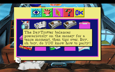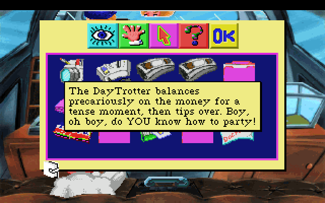 The limo not being there is a great time for me to illustrate how easy this game is. Suppose you didn’t get the DayTrotter from the limo. Or suppose you gave the maître d’ the money to get the first tape, or gave him the credit cards for the second tape. Or didn’t even turn the camera on when “auditioning” Michelle. You can still complete the game! Just keep clicking “talk” on Michelle. You’ll get fewer points, but the game will go on, and there are no walking-dead scenarios in this game. It’s the anti-King’s Quest (or anti-Les Manley).