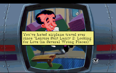Back at the airport, Larry engages in more annoying copy protection to get his next boarding pass (4 points), this time to Atlantic City for a rendezvous with Lana Luscious. I make sure to switch tapes, recharge Larry’s camera in the airport, and head into the identical AeroDork Chartreuse Lounge and board the identical plane. There’s still no coffee here, the cheap bastards, so onto the plane.