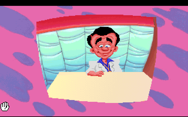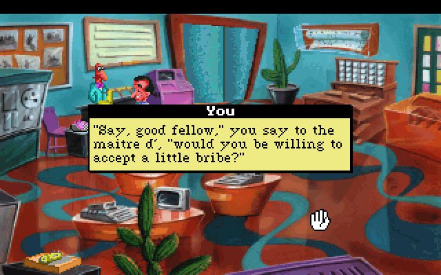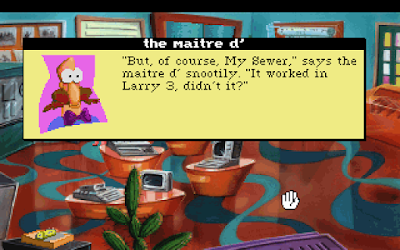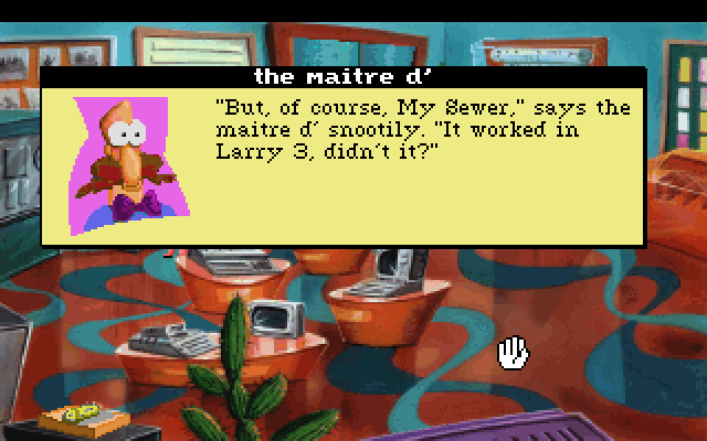 No matter how much money I put in, the maître d’ printed up some membership tape for Larry (3 points), but the money disappeared from Larry’s inventory. Hmm, I don’t know if I like that. I restore, and try talking to the maître d’ a few more times. Eventually, Larry regales him with a little of his upbringing, forcing the maître d’ to cry uncle and give Larry the tape to shut him up.