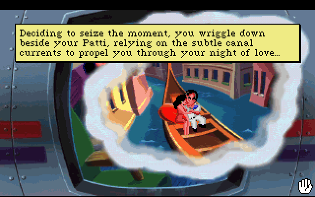 So here we are, with Larry having landed in New York and Patti en route to Baltimore. As you can tell from my last post, the structure of Larry 5 alternates between Larry and Patti, giving a nice symmetry to the two’s concurrent narratives, as well as to my play sessions. When will these plot threads meet? How will the game reconcile Larry and Patti’s amnesia and what happened in Larry 3 with the machinations of the mysterious and sinister Julius? With a plot this stupid, who really cares? On to the Big Apple!