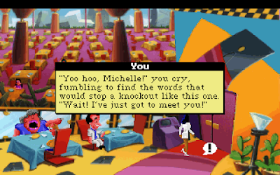 Larry, unable to use any icons but “eye” and “talk” sees Michelle walk by, insert some tape into the machine, and get through the set of double doors (3 points). Nothing I do stops her, and I still can’t get through those doors, so back to the lobby I go.