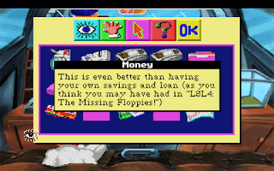 The limo and its driver look and operate exactly the same (the phone, TV, stereo and fax don’t work, Larry can’t take any alcohol, etc.), but the driver is now Bobbi Bangue instead of Bobbi Bang, and some poor schmuck left his or her DayTrotter appointment calendar behind! Taking it (12 points) and opening it (11 points) nets Larry a fat wad of cash, a stack of credit cards held together with a rubber band, and some Swiss bank account numbers. Where was this stuff in Lost Wages?